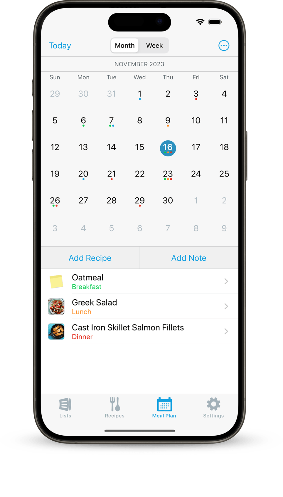 Plan your upcoming meals with calendar and list views. Add recipes and notes for each day. Easily add some or all of the ingredients for upcoming recipes to your shopping list, so you can breeze through the store.