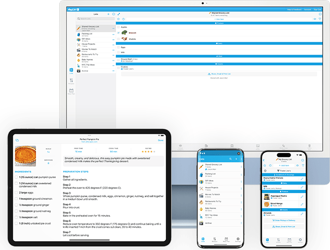 AnyList for the Web gives you full access to AnyList on any Mac or PC with a modern web browser. Plan a big shopping trip from the comfort of a large screen and full-size keyboard, quickly add items to a list without needing to pull out your phone, import recipes directly from popular websites and blogs, and create a meal plan from your recipe collections.