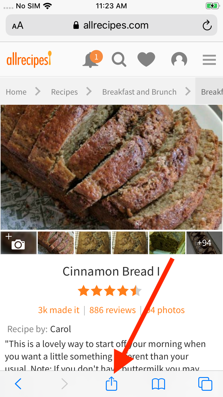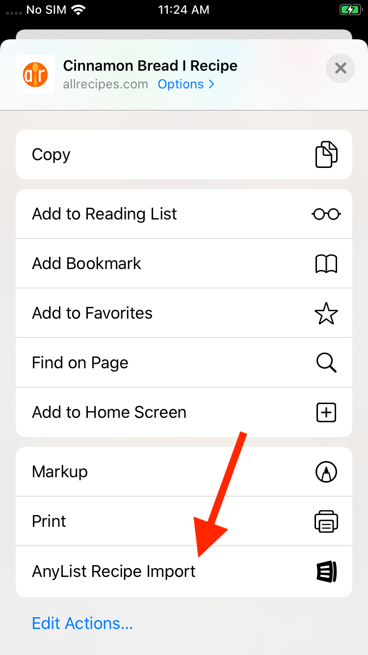 Now the AnyList Recipe Import action will be available. Tap on it while viewing a web page that contains a recipe.