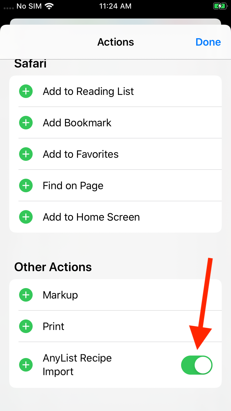 Find the AnyList Recipe Import action, and turn on the switch next to it. Optionally, tap the green plus icon to the left of the action name to make it one of your favorite actions. Then tap Done.
