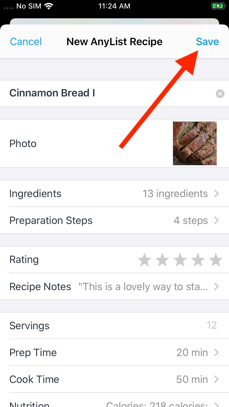 Review the imported recipe, then tap the Save button to save it to your collection of recipes in AnyList.